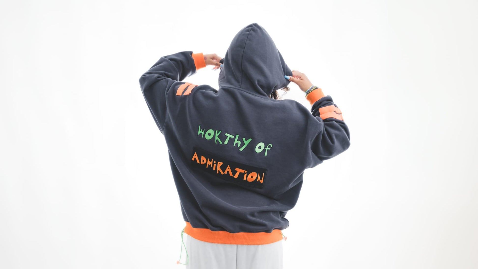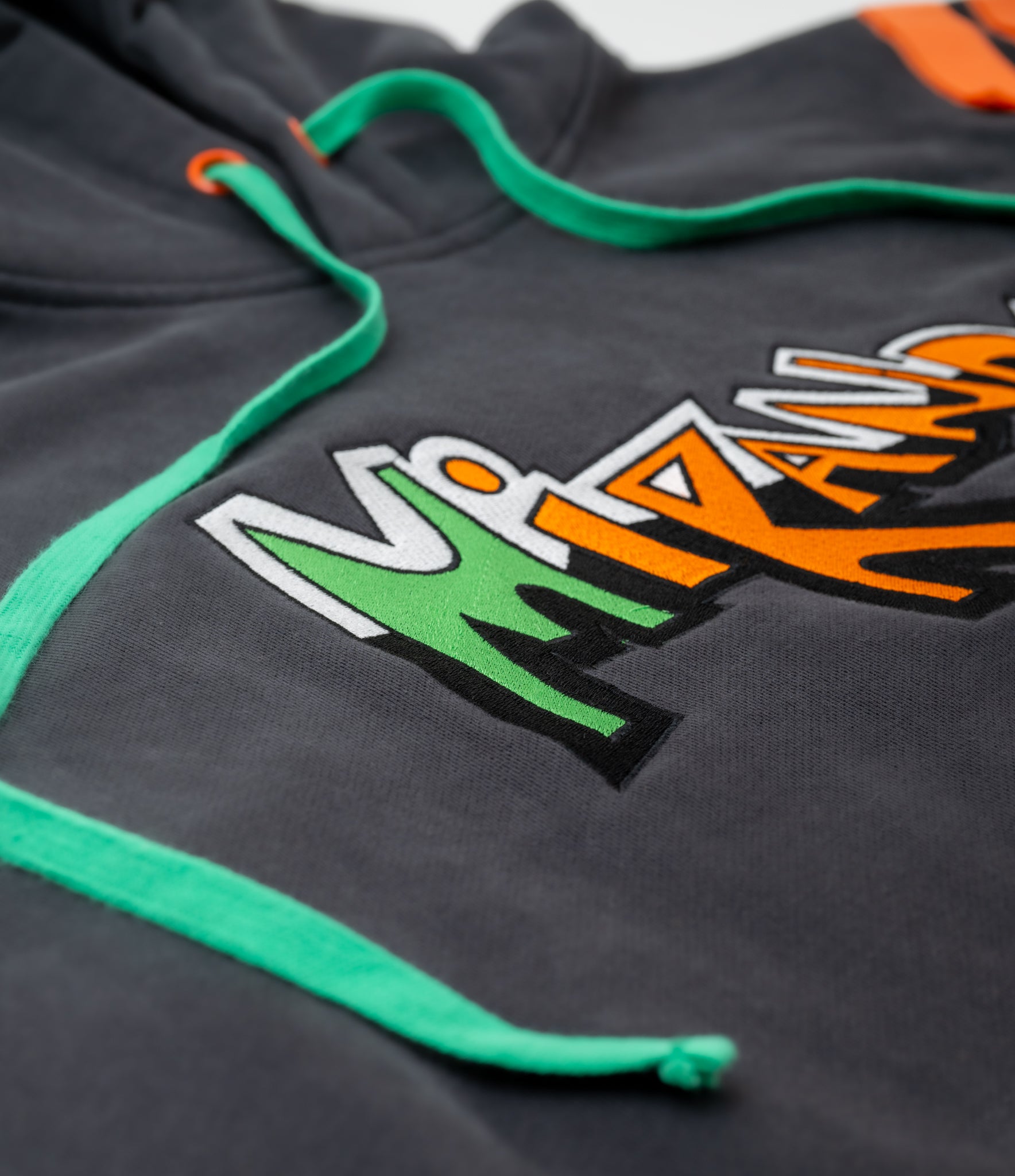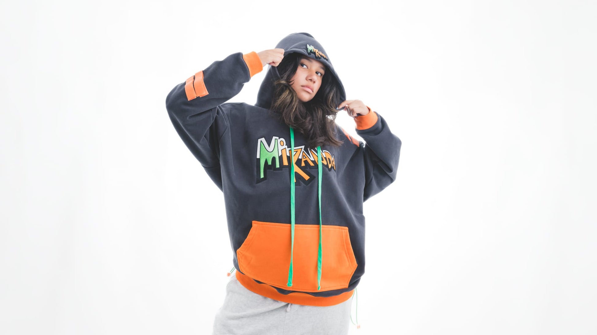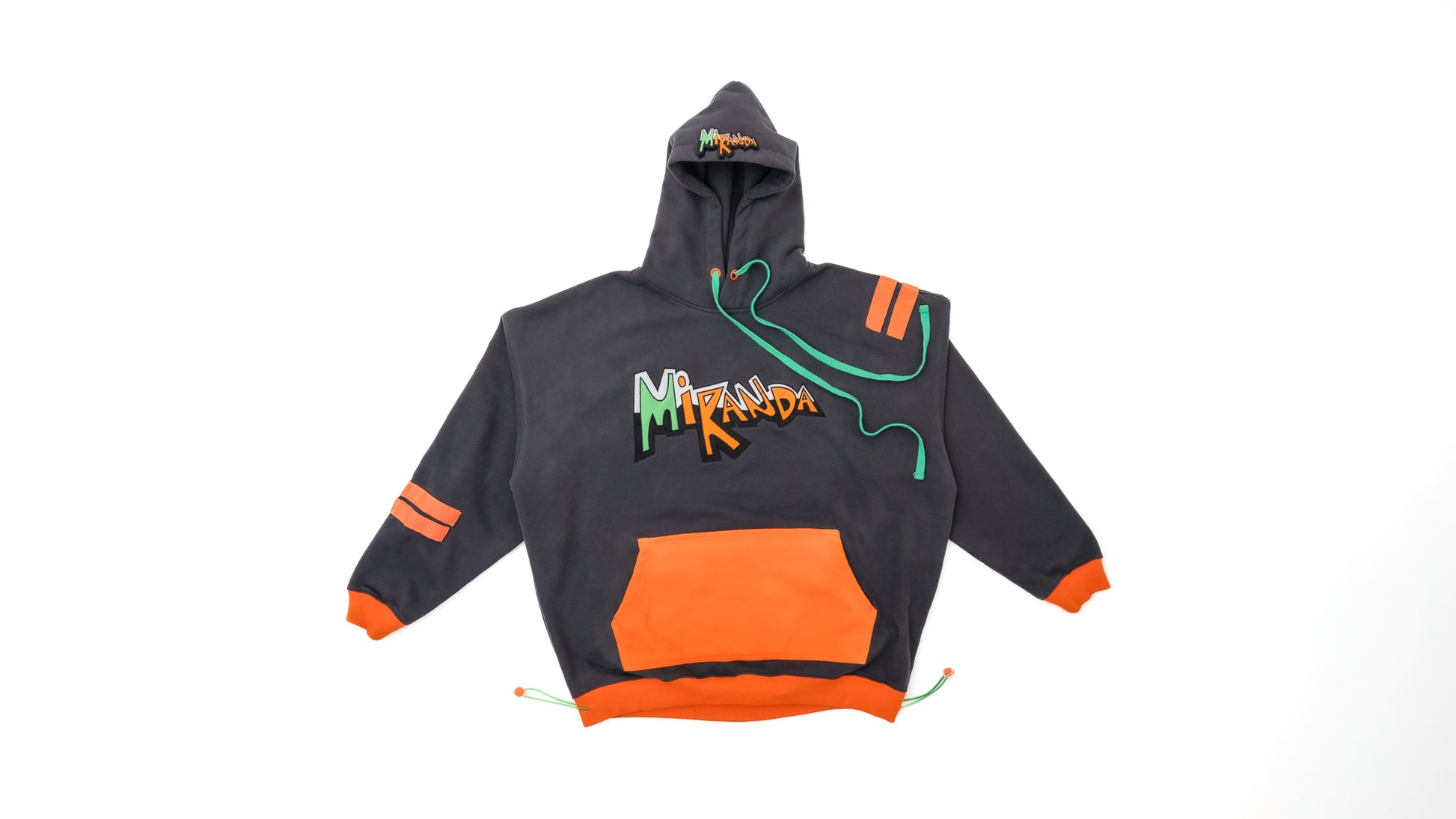 This slightly oversized hoodie features a heavy 500gsm core to provide additional body and structure. The embroidered Miranda logo on the front was designed by me with my own custom font and colors that combine the fun and bright elements of streetwear with style. A floating orange pocket contributes to this bold statement.